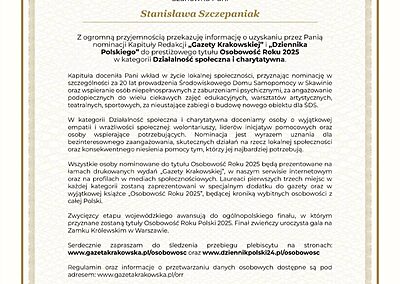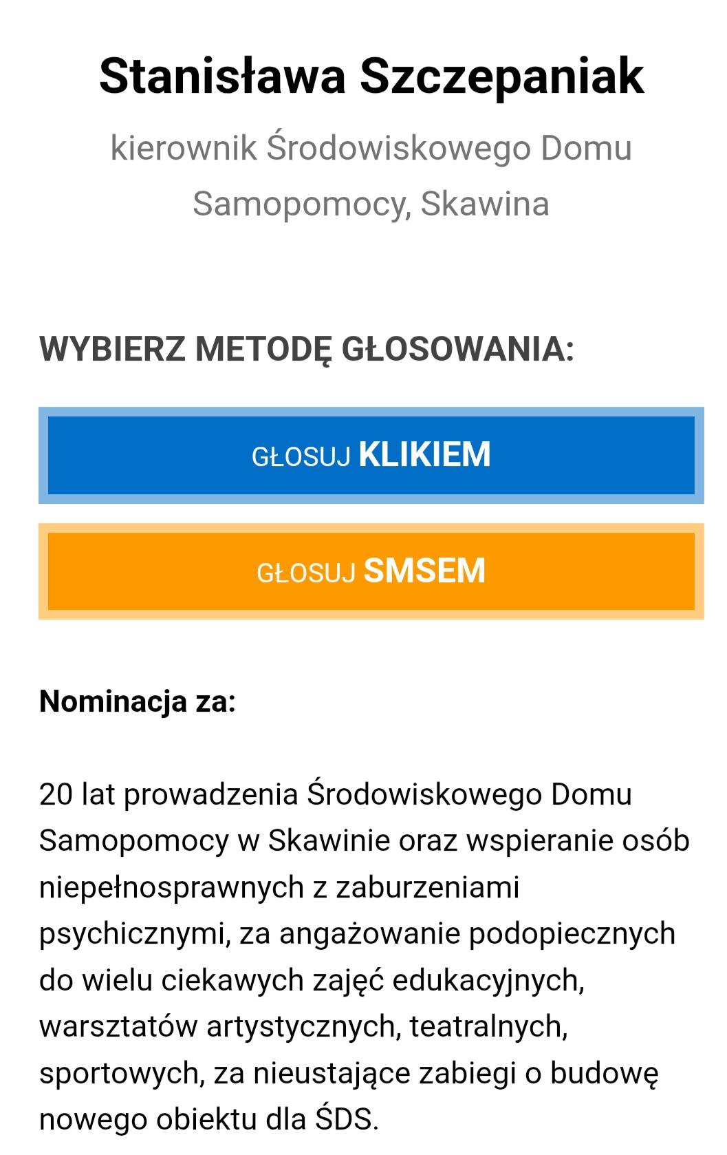 Jesteśmy mile zaskoczeni, że ktoś z Was dostrzegł charyzmę i pasję naszej Dyrektor Stasia Szczepaniak, która od 20 lat działa w lokalnym środowisku na rzecz osób z niepełnosprawnościami.